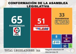 De acuerdo con datos del Tribunal Supremo Electoral (TSE), la Asamblea estará conformada por 65 legisladores de PDC, 51 de LIBRE, 33 de Unidad, 8 de Alianza Popular, seis de Súmate, dos del MAS y uno del pueblo indígena Bia Yuqui. Un escenario muy distinto al de las últimas dos décadas, cuando el MAS dominaba con mayoría absoluta o con dos tercios de votos el escenario legislativo.